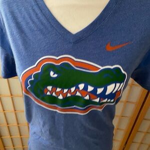 Stylish blue V-neck tee with Gators emblem. Nike logo on the front.