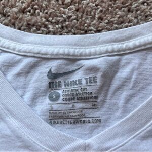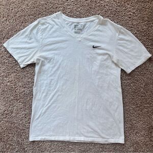 Nike The Nike Tee V Neck Short Sleeve T Shirt. Mens size small. White with black logo. Light cotton material. Some general wear, including cracking in the size graphic inside, and some minor pit staining. I pictured the wear to the best of my ability!