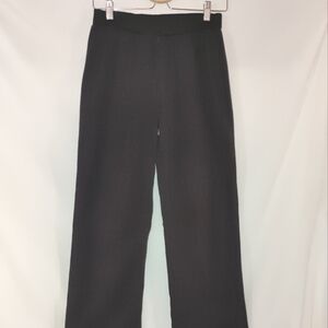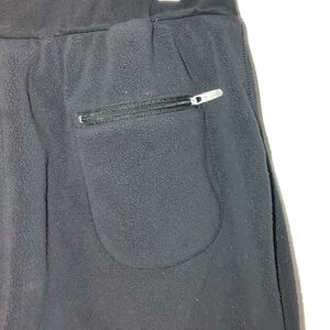 Pull-on style, elastic at the waist, one rear zippered pocket, brushed polyester fleece, straight leg