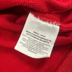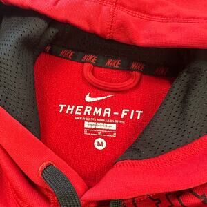 Nike Therma Fit Red Black Mens Medium Diagonal Spell Out Big Logo Fleece Pullover Sweatshirt Hoodie long sleeve spell out brand logo kangaroo pocket ribbed knit cuff and hem 100% polyester lightweight pullover sporty athlete athletic athleisure made in Egypt