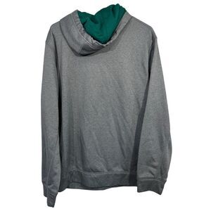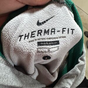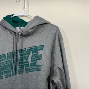 Gently worn men's size large Nike therma-fit fleece lined athletic hoodie sweatshirt. Grey with forest green graphic logo. Pouch pocket, Please review all photos for any signs of wear-pictured as is. Disclaimer: Any items with any wear/staining has not been treated, and unsure of ability to remove/treat condition. Comes from a smoke free home, bundle with other items to save & minimize shipping cost.