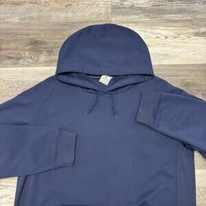 Navy blue front kangaroo pocket hits center mini swoosh logo hooded drawstring brushed fleece inner fabric polyester & spandex blend active training running sporty sports.