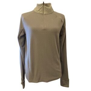 Nike Therma-Fit Quarter-Zip Pullover, Light Gray, Size Small, Women's. Stay warm without the bulk in this Nike Therma-Fit quarter-zip pullover. Featuring textured thermal fabric for cozy comfort and advance moisture management, this athletic piece is ideal for cool-weather workouts or everyday layering. Thumbholes, contrast collar detail and a fitted silhouette complete the sporty look. 96% cotton, 4% elastane. Excellent condition.