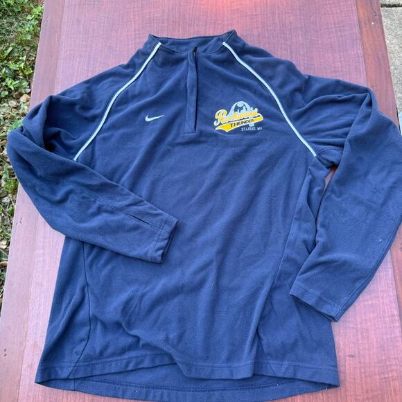 Stay warm and stylish with this Nike Therma-Fit quarter-zip pullover! This navy blue pullover features Rockwood Thunder Volleyball embroidery, perfect for athletes, fans, or anyone who loves a cozy and sporty look.