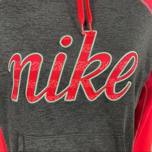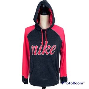 Eye-catching grey and pink color contrasting and a cozy front pouch pocket make this hoodie from Nike a loungewear must-have. Drawstring hood lined in bright pink, pullover fit and (my favorite) thumb holes help keep you warm and comfy. Inside material is fleece. Has some stretch. Size medium and in great preowned condition no flaws and hardly any signs of normal wear beyond inner tag.