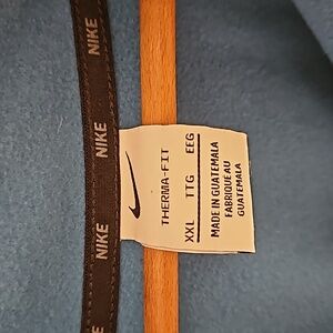 Pre-owned and lightly worn in excellent used condition, blue Nike zippered hoodie men's XXL Therma-fit. Black zipper, front kangaroo pockets, and safety zipper pocket next to the right pocket opening. As pictured. 100% polyester.