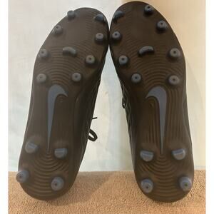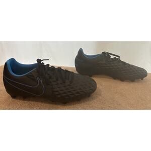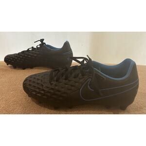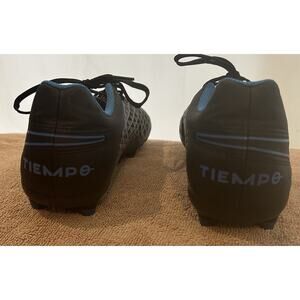 The product is a pair of Nike Tiempo cleats in women's size 8.5, featuring a black and blue color scheme. These cleats are specifically designed for soccer, with a focus on providing comfort, support, and traction on the field. Nike is known for its quality athletic footwear, making these cleats a reliable option for female soccer players looking for performance footwear.