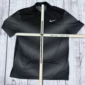 Performance golf polo from the Nike Tiger Woods line featuring a sleek blade collar, breathable Dri-FIT fabric and subtle gray micro-stripe gradient. Stretchy 94/6 poly-spandex with reflective detail at back. Size Men’s Large—see measurements. Clean and ready to wear.