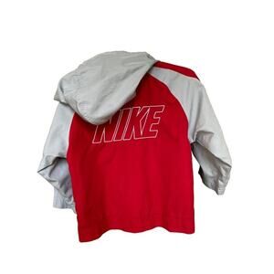This Nike windbreaker jacket is designed for toddlers. It features a red and gray color scheme and a comfortable hood, making it ideal for outdoor play.
