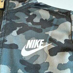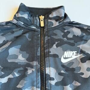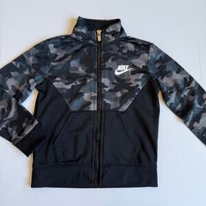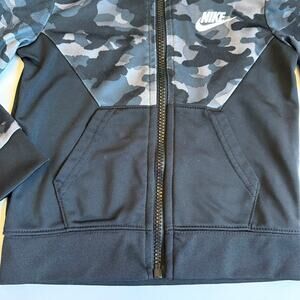 Size 3T Nike black and camo print tricot jacket. Made of smooth polyester. Full-zip front, easy for laying. Large front pockets. White embridered logo on chest. No stains or flaws, very good used condition.