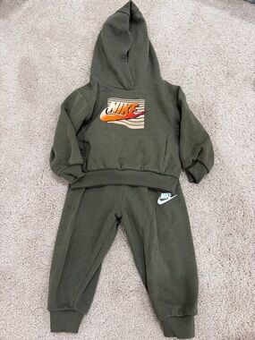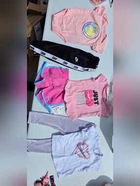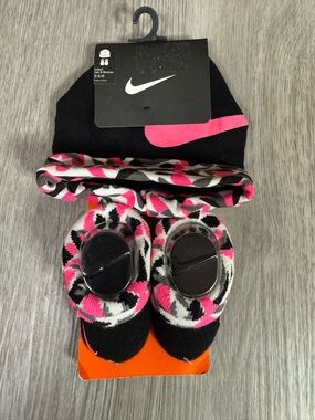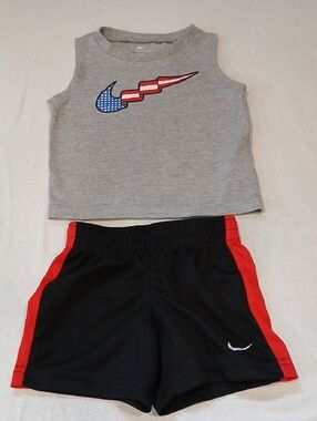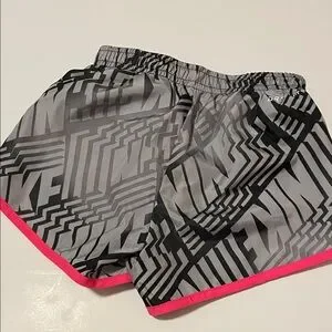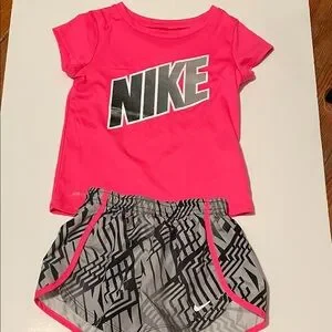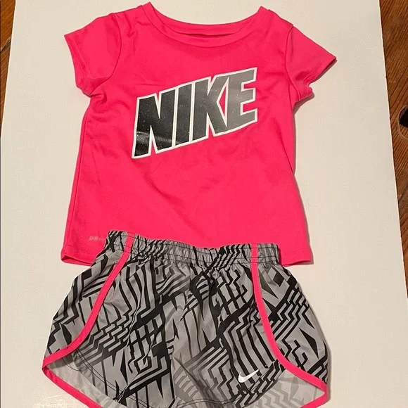 Nike Toddler Girl 3-4 Yrs 4T Hot Pink Tee & Gray Geometric Shorts Matching Set. Vibrant hot pink Nike tee with bold logo. Gray shorts feature black geometric print and hot pink trim. Lightweight active set for play and sports. Gently used in good condition. Smoke & pet free home.