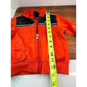 The Nike Toddler Track Suit 2-Piece Set in Orange and Gray, size 12 months, is a stylish and comfortable outfit for young boys. This set includes a zippered jacket with a V-neckline and long sleeves, perfect for all seasons. The lightweight jersey fabric ensures comfort, while the colorblock pattern adds a fun and colorful touch. The set is ideal for casual wear or travel, with features like media pockets and a 15.5" inseam in the pants. Made from 100% polyester, this athletic fit outfit from Nike is both practical and fashionable for active little boys.