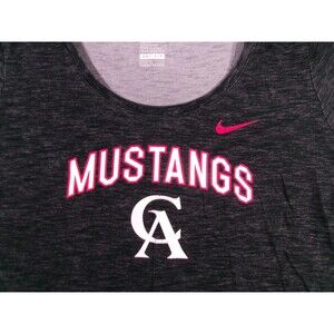 Pre-owned Nike Dri-Fit women's scoop tee in good condition with no visible stains or damage. Front features Mustangs text and CA team graphic with a small Nike Swoosh; fabric is a lightweight slub Dri-Fit blend. See photos for close-up of condition and accurate sizing.- Fast Shipping Guaranteed, Same or Next Day Handling Time!