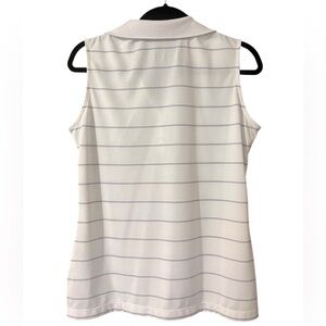 Experience the perfect blend of style and comfort with this Nike sleeveless polo top. Featuring a crisp white base with subtle black stripes, this fitted top is ideal for warm weather or athletic activities. The classic polo collar adds a touch of sophistication to your casual wardrobe. Excellent condition, no flaws. Pet and smoke free home.