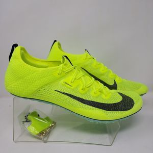 Elevate your track and field game with these Nike Zoom Superfly Elite 2 athletic shoes. Featuring a green solid color and knit logo theme, these shoes are designed with spikes for enhanced traction on the field. The lace-up closure ensures a secure fit for intense activities, while the mesh upper material provides breathability during winter, summer, fall, and spring seasons. These shoes are perfect for any track and field occasion. The low-top shoe shaft style and standard shoe width make it comfortable for any foot type, while the Nike Zoom Superfly Elite product line guarantees quality and durability. These shoes are the perfect addition to any athletic shoe collection. Includes spikes and tool shown on pics.