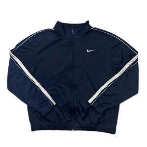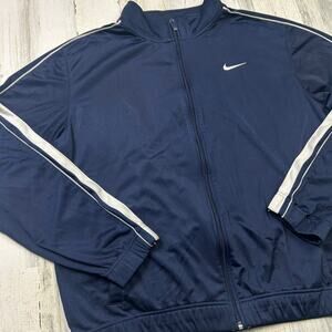 Nike Track Jacket Striped Men's Activewear Zip-Up Blue in size men's large. The jacket is in great 9.2/10 condition but does have some minor yellowing on the sleeve (shown in picture 3).