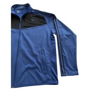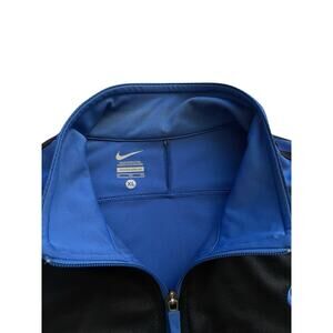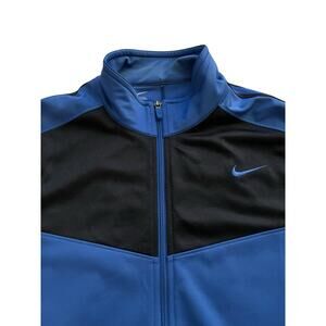 The Nike Track Jacket in black and royal blue with stripes on the arms, size XL, is a stylish and functional activewear piece perfect for various activities like cycling, running, or basketball. Made of 100% polyester with a lightweight design, this jacket features a full zip closure, pockets for convenience, and is part of the Nike Training product line. The blue color and striped pattern add a sporty touch to the classic track jacket style, making it a versatile addition to any man's wardrobe.