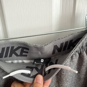 Gray track pants from Nike, perfect for athletic activities or casual wear. These pants feature a comfortable elastic waistband and a stylish red side stripe with a unique pattern. The iconic Nike swoosh logo is embroidered on the left leg. Pre-owned condition, see photos for wear and measurements. Smoke and pet free home.