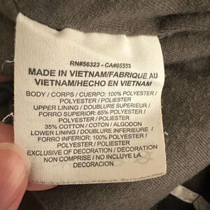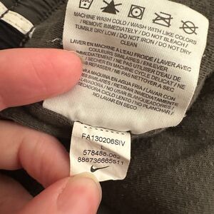 Classic Nike Track Pants in a Kids' Large—perfect for active youth or retro-loving mini trendsetters! These gray athletic pants feature black side panels and crisp white piping down each leg. The embroidered Nike logo appears on the left thigh with a small faint mark (see close-up photo). Crafted from 100% polyester with a smooth, comfortable lining. Made in Vietnam.