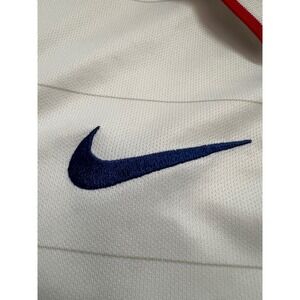 Elevate your fan status with this stylish and authentic Nike US Soccer Polo Shirt, a timeless piece that proudly showcases your support for the national team. This pristine white polo features classic red accents on the collar and sleeves, adding a touch of sporty sophistication to your look. The iconic US Soccer crest is prominently displayed on the chest, and the subtle horizontal stripes give it a modern, refined aesthetic. Crafted with Nike's innovative Dri-FIT technology, this polo shirt ensures maximum comfort and breathability, keeping you cool and dry whether you're cheering from the stands or enjoying a casual day out. The 2014 authentic detail adds a touch of nostalgia for dedicated soccer fans. Perfect for game days, weekend outings, or simply expressing your love for the beautiful game, this polo shirt is a versatile addition to any wardrobe.