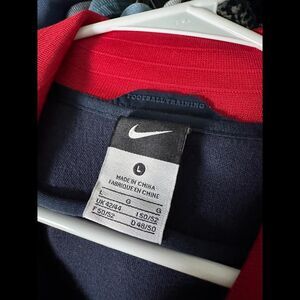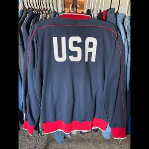 navy blue, athletic jacket, zip-up, logo patch, retro style, sporty, colorblock, breathable material, trackwear, casual athletic