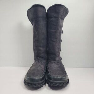 Designed for cold weather, these boots feature a durable suede exterior, faux fur lining, and secure side button closures for warmth and style.
