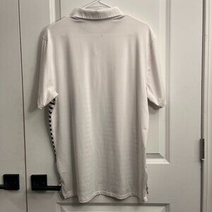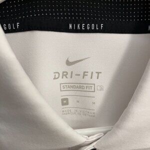 Nike Men's Vapor Graphic Golf Polo Shirt. This striped polo shirt is brand new with the tags attached and has never been worn or used. It is a size M and the color is White with black stripes on the bottom half. Swoosh logo on the left chest. 2 button placket.