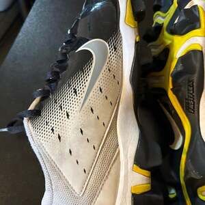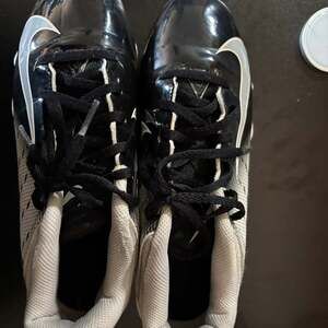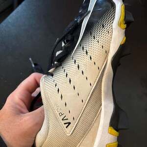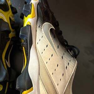 Nike Vapor Untouchable Shark 3 football cleats in black, white, and yellow, size 6Y. These youth cleats feature a durable synthetic upper with 'Vapor' branding, black laces, and the iconic Nike swoosh. The sole is equipped with Nike Fastflex technology for enhanced agility and traction. Perfect for aspiring athletes on the football field or for general athletic wear. The cleats are in good, used condition with normal wear.