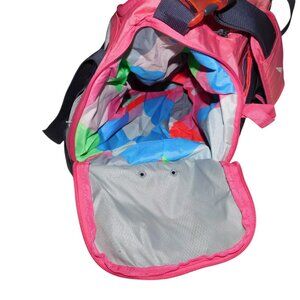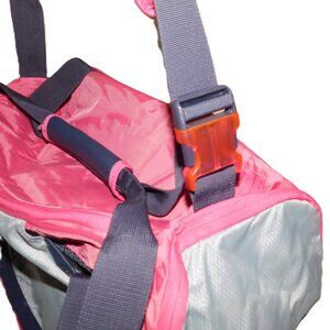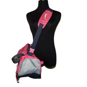 Nike sports or gym duffle bag with separate shoe compartment and valuables pocket. Pink / purple / gray colors. Multiple pockets and storage pockets and adjustable shoulder strap.