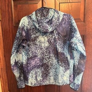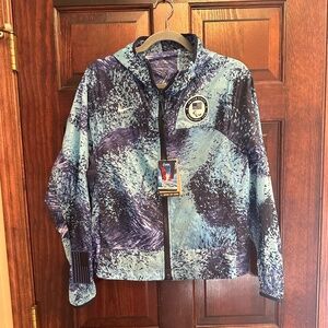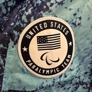 This Nike Village Wear USA Paralympic Team Hooded Jacket in Blue is a mid-length jacket suitable for various occasions such as training, travel, casual wear, and working out. Made with nylon outer shell material and featuring an abstract pattern in blues and black, this jacket has long sleeves with a magnetic type front zip closure. The jacket includes zipper pockets, embroidered logos, an arm US flag, and a hood for added protection against the elements. With a size XS and athletic fit, this jacket is perfect for outdoor activities in the winter, fall, and spring seasons, making it a versatile and practical choice for women.