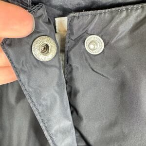 Excellent preowned condition. Vintage black snap up hooded lightweight windbreaker jacket. Has red & white striping on back & sleeves. Hood tucks away with snaps. Soft gray lining. Pockets on lower front. Nylon/polyester/cotton material. Approx. measurements: Shoulder to hem 32", pit to pit 25", sleeve from neck to sleeve hem 30". Women's Size XL.