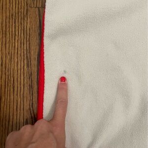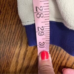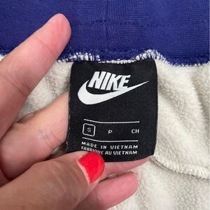 These are vintage Nike jogger style sweatpants. They are a cream color, have an embroidered purple Nike check, side pockets and have an orange accent stripe down the sides of both legs. They are super soft, 100% polyester and show minimal pilling in the crotch. There is a small stain on the back of one leg, please see the last photo. The purple and orange are still super vibrant and the pants are a size small.