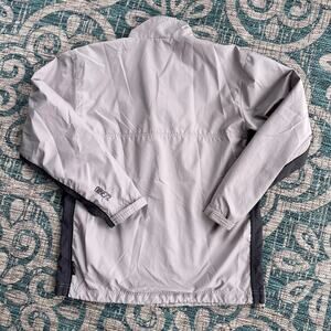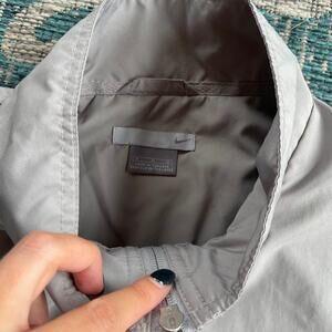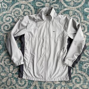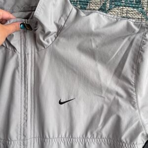 This is a vintage Nike full-zip track jacket in a light grey color with dark grey/black side panels and sleeve accents. It has a standing collar, two front pockets, and the Nike swoosh logo on the chest. The back of the collar also features a small tag with the Nike logo. The jacket is a lightweight material, ideal for layering or athletic activities.