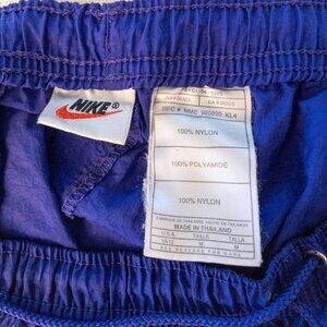 Classic Nike men’s athletic shorts in bold purple nylon. These vintage 90s gym shorts feature a lightweight construction, elastic waistband with drawstring, and embroidered Nike swoosh on the leg. Made in Thailand, tagged size Medium (fits waist approx. 32–34"). Perfect for retro streetwear lovers, athletes, or collectors of vintage Nike apparel.