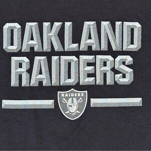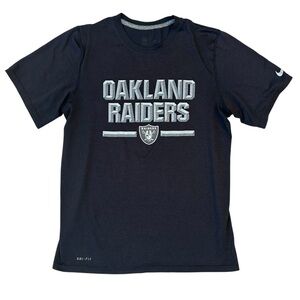 This Nike short sleeve tee features a bold Oakland Raiders graphic in light gray against a black background. The standard crew neck design is made from a comfortable cotton blend, making it perfect for everyday wear.