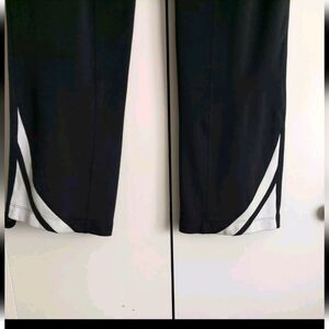 Black with white Stripes on back leg. Stretchy. Poly Spandex blend