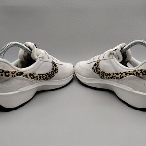 Elevated everyday style arrives in these sleek Nike sneakers. A playful twist on classic design, they boast a crisp white base punctuated by a bold leopard print Swoosh and heel accent, lending a touch of wild sophistication to your stride. These shoes feature a streamlined silhouette, perfect for adding a sporty edge to any outfit, along with cushioned insoles promising all-day comfort, making every step feel like walking on clouds. Envision yourself turning heads on weekend coffee runs, styling these with your favorite athleisure wear for a workout class, or even adding an unexpected edge to your favorite casual Friday ensemble.