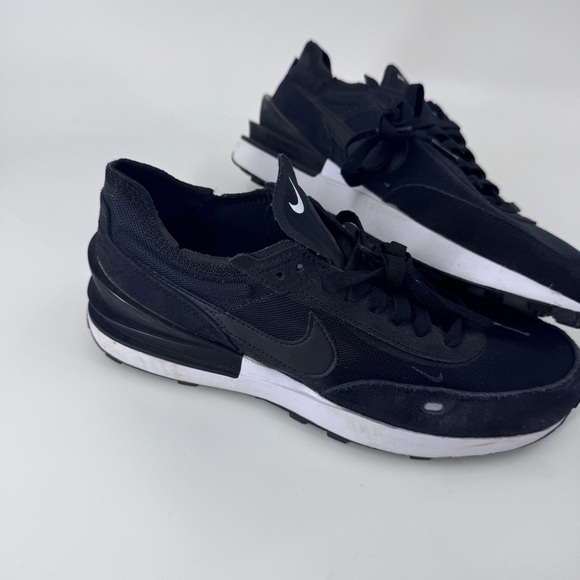 Experience the perfect blend of style and comfort with these Nike sneakers, featuring a sleek black upper and a contrasting white midsole. Designed with a low-top silhouette, these shoes offer a sporty look with a mix of suede and mesh materials. The traditional lacing system and visible stitching details add to their timeless appeal.