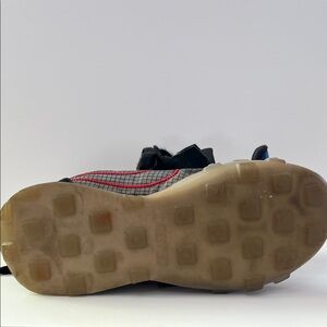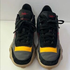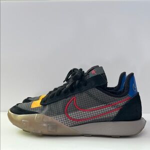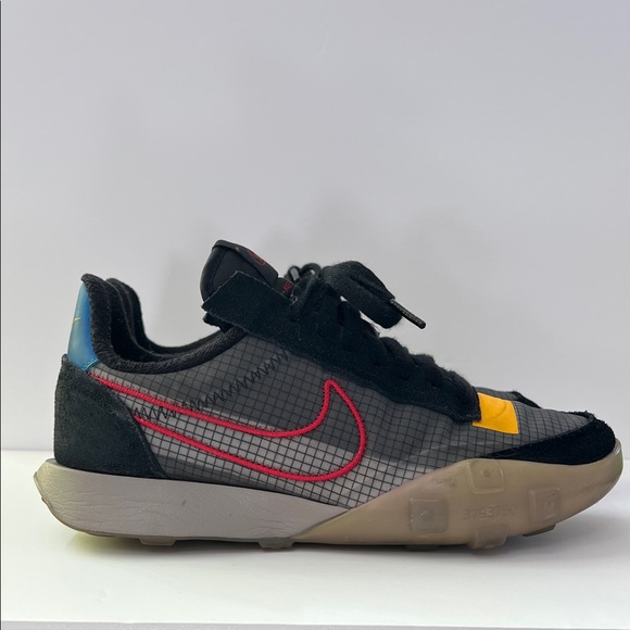 Nike Waffle Racer sneakers with black and gray design. Features bold red swoosh and yellow highlights. Ideal for everyday style.