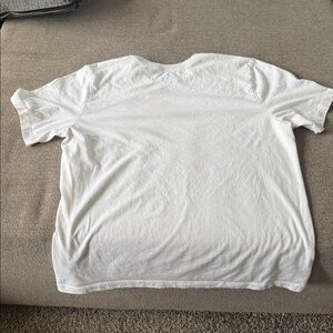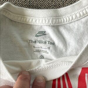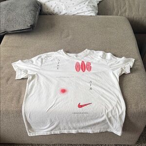 White Nike t-shirt with red graphic design. Features Nike logo and unique print.