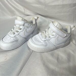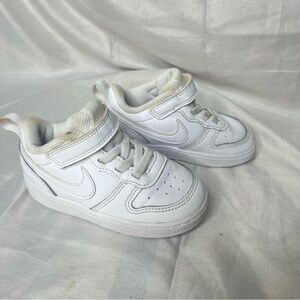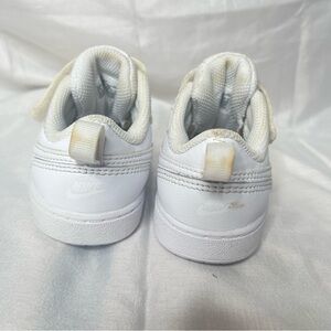 These Nike sneakers feature a sleek all-white design with a convenient velcro strap for easy wear. Crafted with a durable leather-like material, they offer a classic athletic style with perforated detailing for breathability. The well-padded ankle area ensures comfort, making them perfect for everyday activities.