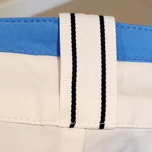 Nike White, Navy Leg Stripe Active Capri Track Pants, Perfect On the Go Sporty Capri Pants, Pull On, Zip Up Front Waist Closure with Inside Drawcord Tie, Crisp White with Contrast Light Blue Waist Grosgrain Fabric Trim, Grosgrain Fabric Navy Blue Tuxedo Leg Stripe, Embroidered Nike Front Waist, Nack Waist Tab Loop, 2 Hip Pockets, Capri Crop Length with V Split Leg Hem, 62% Polyester, 38% Nylon, Women's Size XL, Like New Condition, No Wear, Washed And Air Dried, Never Worn, Smoke-free Home, Approximate Measurements: 34" Waist to Leg Hem Length, 18.5" Waist, 10" Front Rise, 24" Leg Inseam