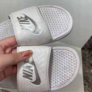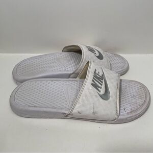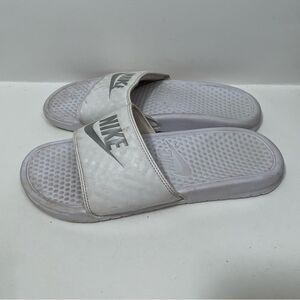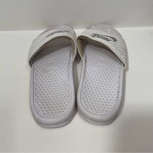 Gently worn women’s size 9 Nike white slide on athletic sandals. Please review all photos for any signs of wear-pictured as is. Disclaimer: Any items with any wear/staining has not been treated, and unsure of ability to remove/treat condition. Comes from a smoke free home, bundle with other items to save & minimize shipping cost.