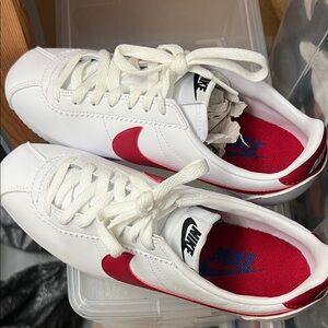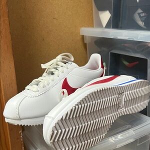 Classic Nike design with bold red swoosh. Blue stripe on the sole adds contrast. Comfortable and stylish.