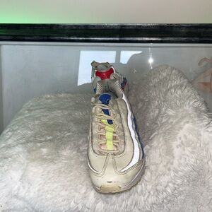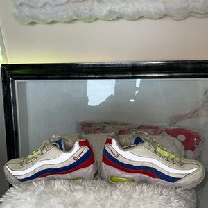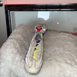 Nike sneakers in white with striking red and blue details. Ideal for casual wear.and have a very vintage look to them the white is nationally off white light pink and some neon in color , warm a few times but not accessible amounts due to a permanent leg injury