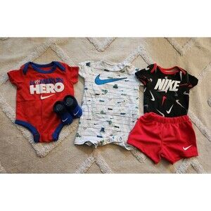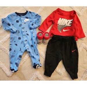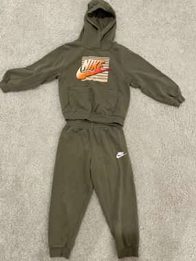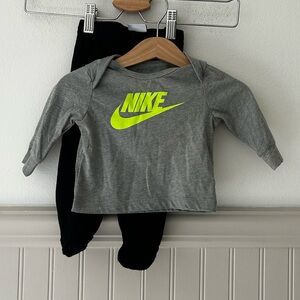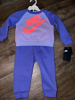Two-piece Nike active set. White crew sweatshirt with pink Nike wordmark and leopard-print Swoosh. Black leggings with pink logo and coordinating leopard-print panels. Cute and sporty look for everyday wear.