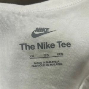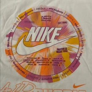 White Nike tank top featuring a vibrant graphic print in orange and purple.
