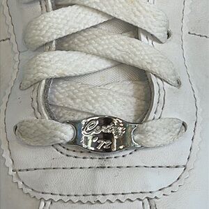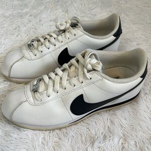 Experience the iconic style of Nike Cortez sneakers, featuring a sleek white leather upper accented by a bold black swoosh. These sneakers offer a minimalist silhouette with a low-cut design and traditional lacing, making them a versatile choice for any outfit. VERY GOOD PREOWNED CONDITION