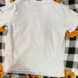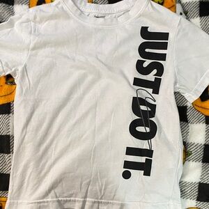 White Nike tee with vertical black 'Just Do It' print. Bold and modern design.