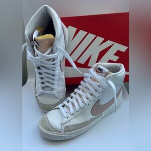 Nike high-top sneakers in white with light pink accents. Sleek and modern design.